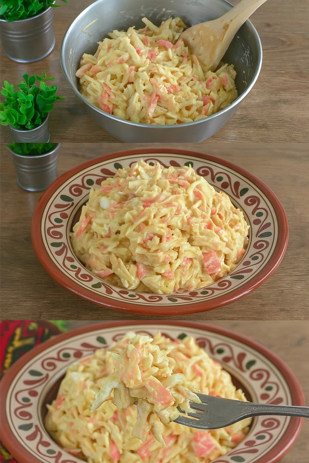 **Rezultatul** este o salată bogată, aromată și delicată. Această combinație neobișnuită de ingrediente, mai ales morcovul în stil coreean, cu siguranță va fi pe placul familiei voastre.