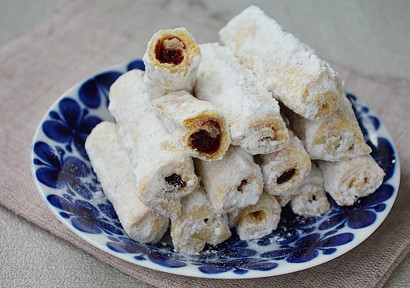 Cornulete tigarete. Cornulete tigarete fragede. Cornulete umplute cu magiun. Reteta cornulete tigarete. Desert traditional romanesc. Retete de cornulete cu gem. Cum se fac cornuletele tigarete. Retete de patiserie de casa. Cornulete fragede cu untura.