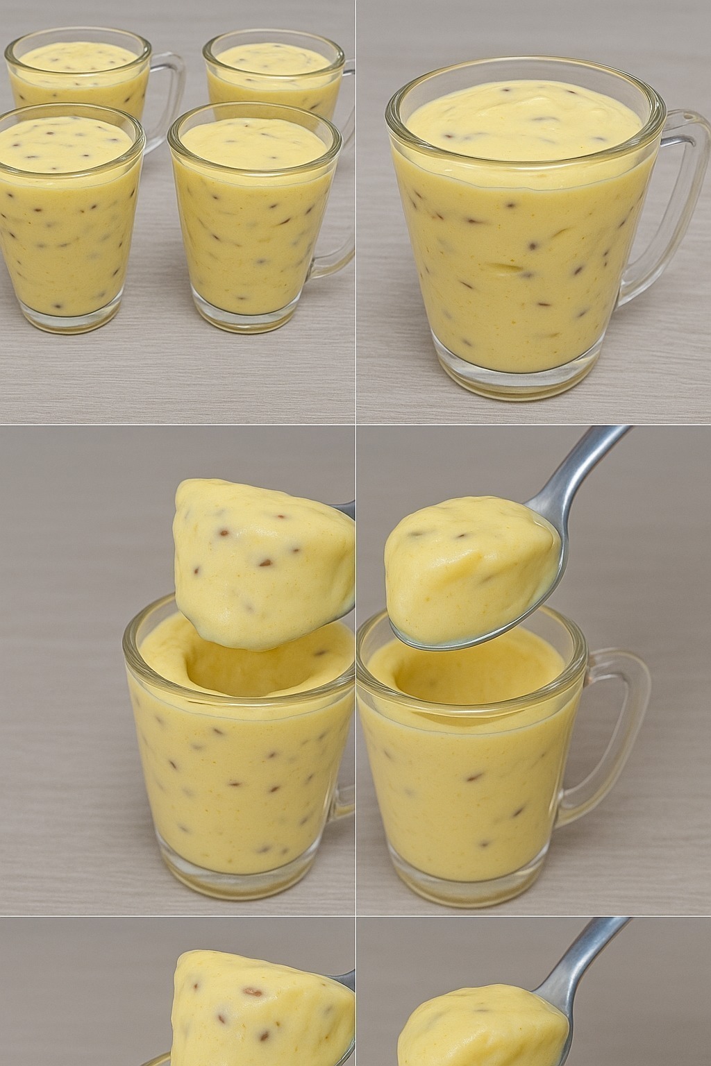 Toarnă compoziția în boluri sau pahare, acoperă cu folie și lasă la rece cel puțin 2 ore. Cu cât stă mai mult, cu atât e mai bun.